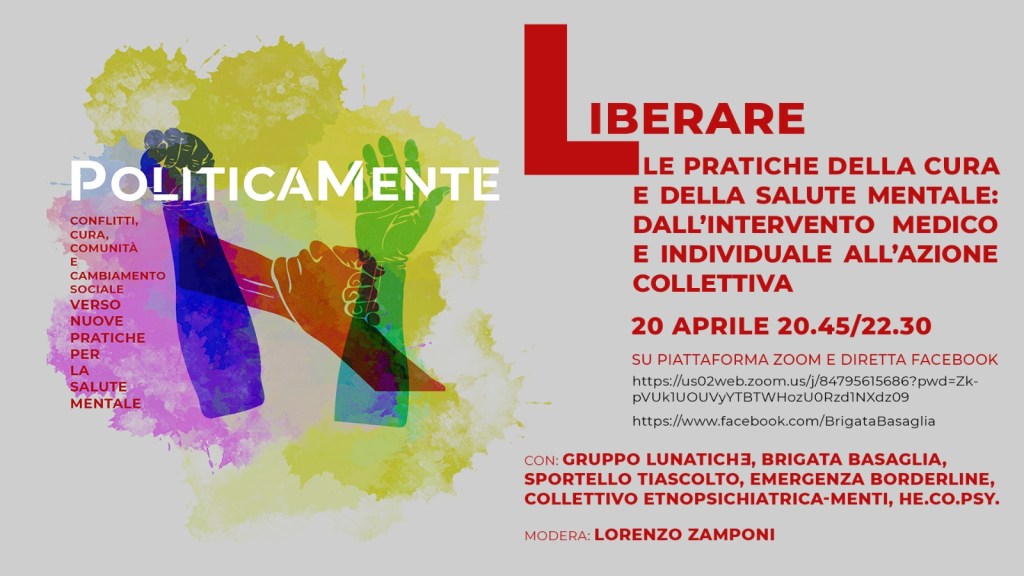 Liberare le pratiche della cura e della salute mentale: https://us02web.zoom.us/j/84795615686?pwd=ZkpVUk1UOUVyYTBTWHozU0Rzd1NXdz09