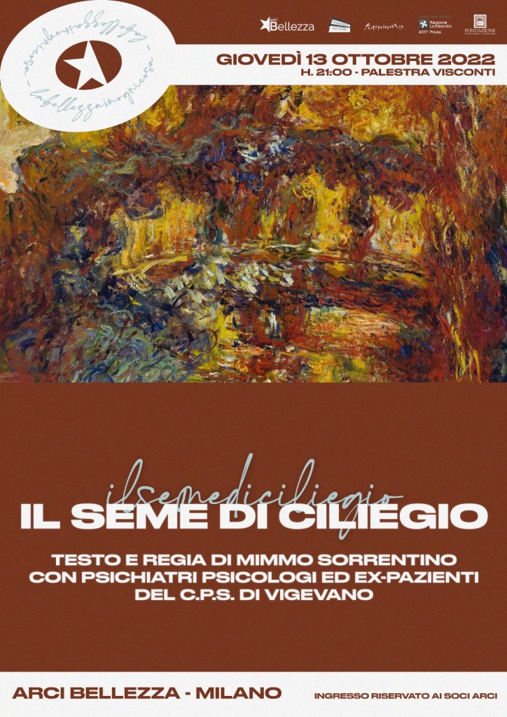 La salute mentale non è solo l’assenza del disagio, ma anche la possibilità di incontrarsi, relazionarsi in modo sano, realizzarsi e vivere la propria comunità. In occasione della Giornata Mondiale della Salute Mentale, a partire dal 10 ottobre, la Città di Milano vedrà una serie di iniziative diffuse per la promozione di tale diritto al benessere. Lo Sportello TiAscolto Milano, insieme con la Cooperativa Teatro Incontro di Vigevano e con il Circolo ARCI Bellezza di Milano, è lieto di invitarVi allo spettacolo “Il seme di ciliegio” di Mimmo Sorrentino, giovedì 13 ottobre alle ore 21:00. Uno spettacolo di teatro sociale nel quale è l’ascolto dell’altro il cuore della rappresentazione e il suo nucleo di senso. Nelle parole di Sorrentino, “il teatro – e l’arte in generale – può aiutare a ricucire” spazi e relazioni comunitarie, trasmettendo fiducia, mettendoci in gioco e sfidando ruoli e confini; per questo, desideriamo che il presente invito sia anche un’occasione di incontro, conoscenza e costruzione di comunità.