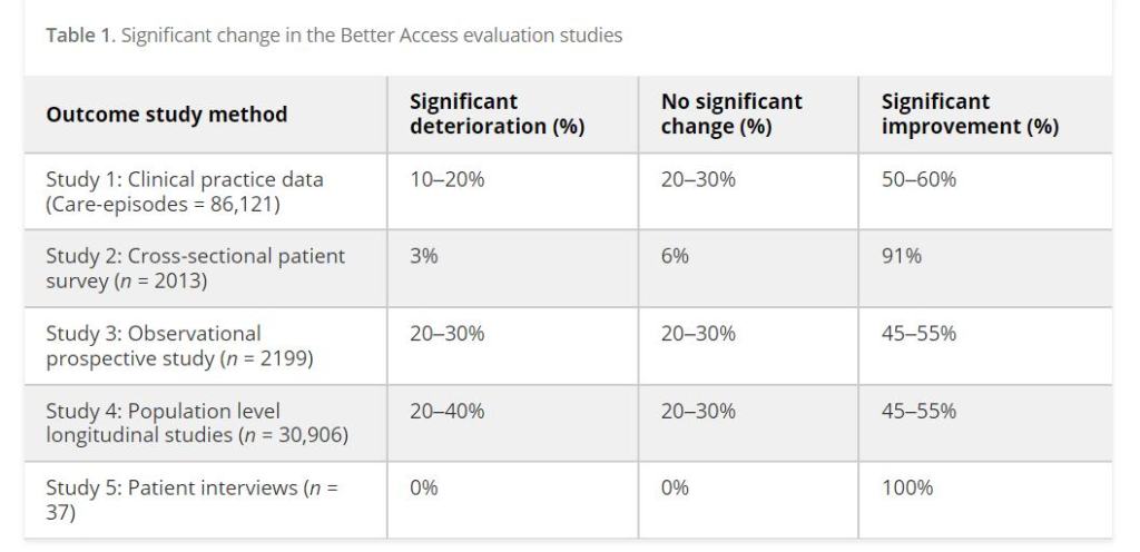 Dal 2021, un australiano su 10 ha usufruito di Better Access e uno su 20 ha fatto una o più sedute di psicoterapia, con un costo per il governo australiano di 1,2 miliardi di dollari australiani. Nel dicembre 2022 è stata pubblicata una valutazione indipendente d’impatto dell’iniziativa [2] i cui risultati principali relativi agli interventi di psicoterapia sono stati sintetizzati in un recente articolo [3].