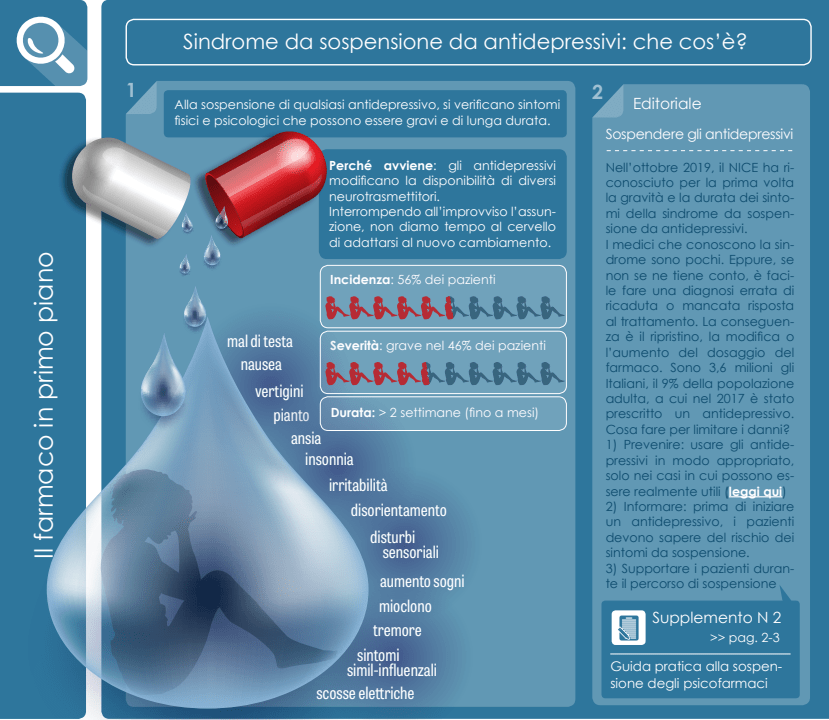 Ad ora, gli strumenti principali maggiormente adottati sono rappresentati dalla formulazione di Linee Guida e raccomandazioni, per i servizi e i professionisti, finalizzate a deprescrizione [5] e sospensione per molte classi di farmaci, tra cui gli antidepressivi. Un caso paradigmatico, relativo agli antidepressivi, è costituito dall’aggiornamento nel Regno Unito delle Linee Guida NICE, tra le più autorevoli a livello internazionale. Questo aggiornamento è da intendersi come finalizzato tanto a limitare i danni e il rischio di danni, come ad esempio la disfunzione sessuale post-SSRI [6], legati ad un uso prolungato e inappropriato di antidepressivi da parte di un’ampia fascia di popolazione, quanto a fornire indicazioni agli operatori per sostenere le scelte di quella fascia di popolazione che, pur non avendo ancora subito tali danni e non essendo in situazione di rischio, vorrebbe sospenderne l’uso.