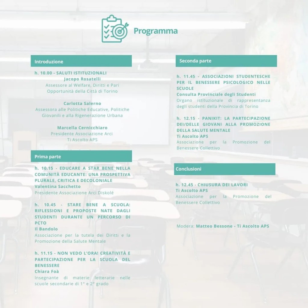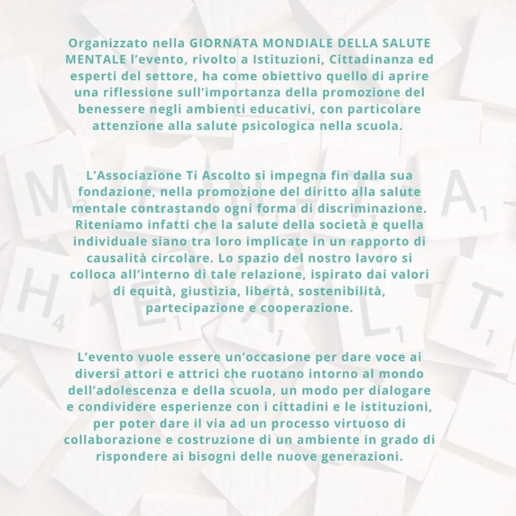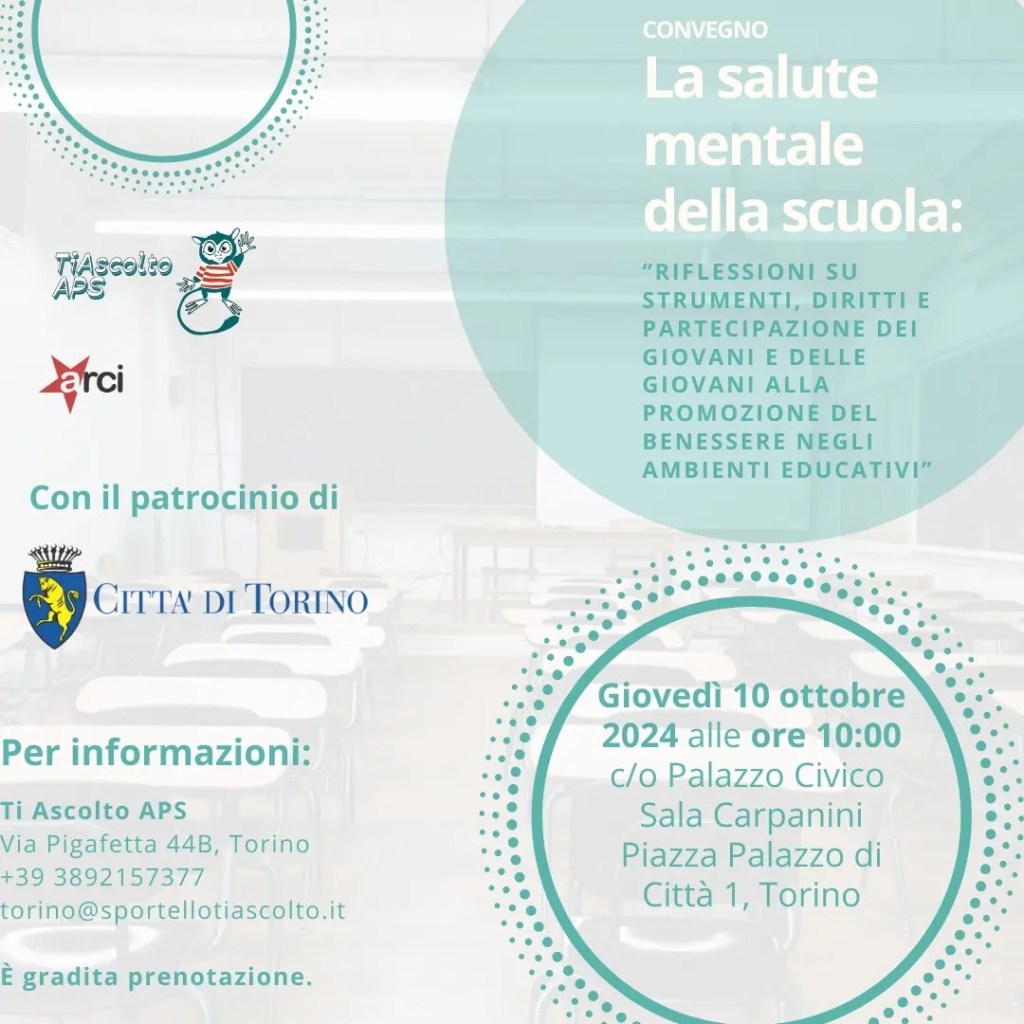Il 10 Ottobre, in occasione della Giornata Mondiale della Salute Mentale, avremo il piacere di confrontarci, insieme a molti attori coinvolti nella tutela del benessere e della salute mentale nelle scuole, durante il convegno “La salute mentale della scuola: riflessioni su strumenti, diritti, e partecipazione dei giovani e delle giovani alla promozione del benessere negli ambienti educativi”, con il patrocinio della Città di Torino.