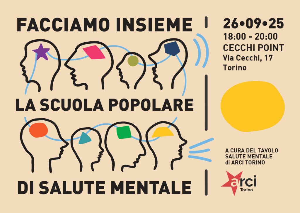 Un nuovo percorso collettivo sta per prendere vita a Torino: la Scuola Popolare di Salute Mentale, un progetto pensato e costruito dal Tavolo Salute di Arci Torino, a cui in questi mesi hanno partecipato attivamente Ti Ascolto Aps, Cactus Psicologia, Co.Mu.net – Officine Corsare, e Inv3rso Aps.