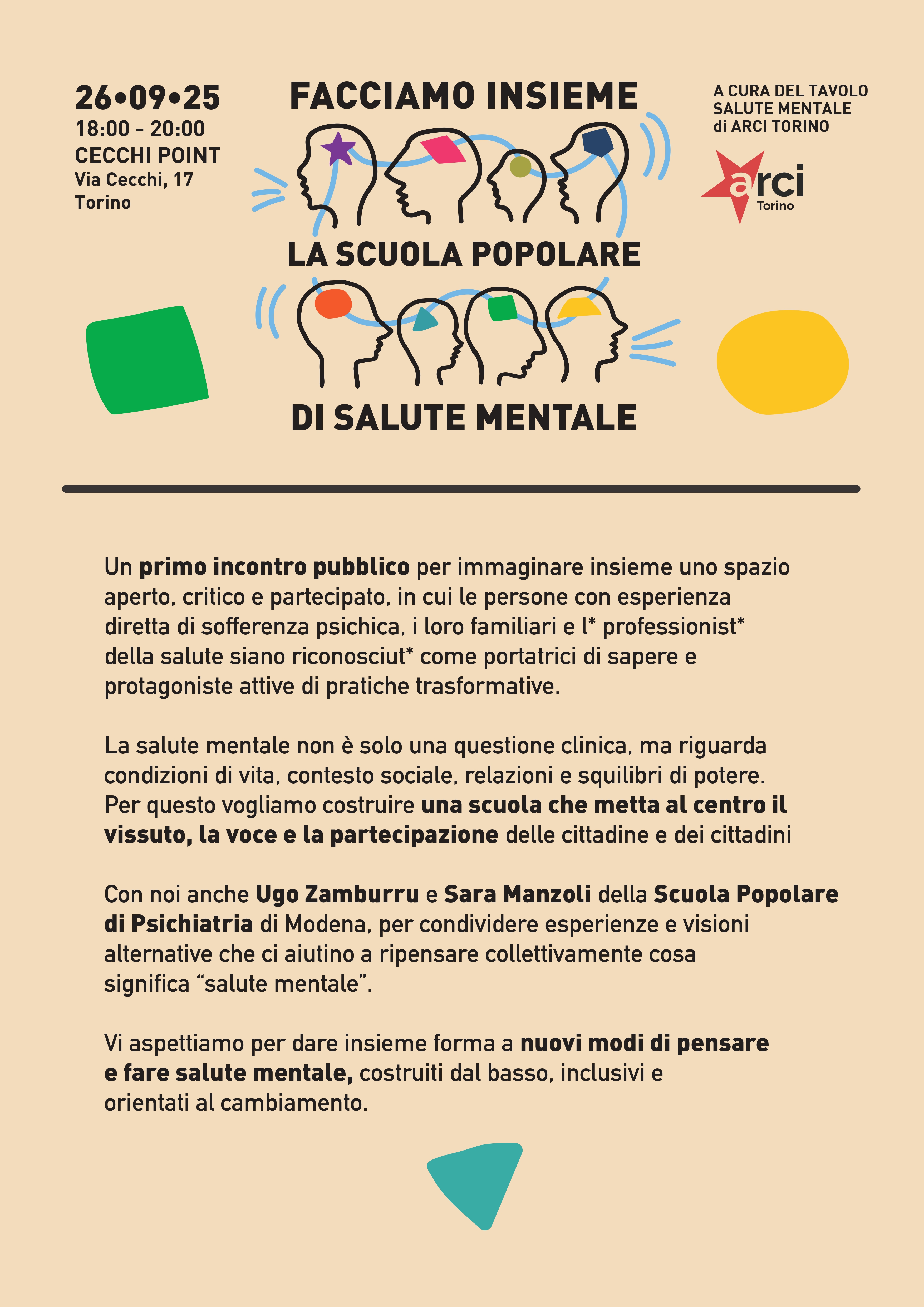 Un nuovo percorso collettivo sta per prendere vita a Torino: la Scuola Popolare di Salute Mentale, un progetto pensato e costruito dal Tavolo Salute di Arci Torino, a cui in questi mesi hanno partecipato attivamente Ti Ascolto Aps, Cactus Psicologia, Co.Mu.net – Officine Corsare, e Inv3rso Aps.