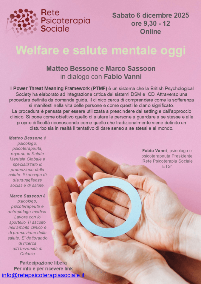 Sabato 6 dicembre dalle ore 9.30 alle ore 12.00 la Rete di Psicoterapia Sociale organizza, nel contesto dei webinair “Welfare e Salute Mentale oggi” un dialogo attorno al PTM.