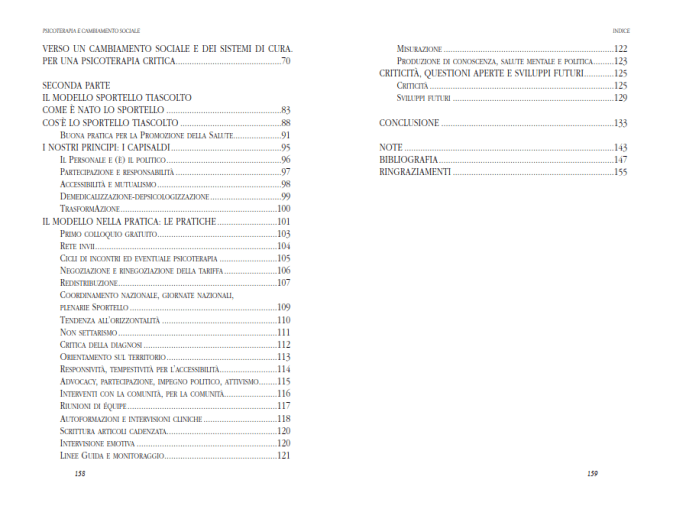 La prima parte offre una cornice concettuale che attinge all’epidemiologia, all’antropologia e alla sociologia, con uno sguardo sempre attento alla giustizia sociale. Si apre poi a una prospettiva storica e politica sul dibattito intorno alla psicoterapia sociale, proponendo una definizione di psicoterapia critica. L’ultima parte entra nel merito delle pratiche e dei principi che strutturano il lavoro dello Sportello, come pratica collettiva, collaborativa e autogestita.