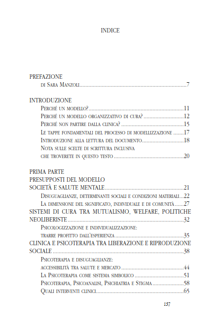 Al centro, e trasversalmente, si sviluppa una riflessione sul difficile equilibrio tra trasformazione sociale e cambiamento individuale, a partire da un presupposto chiaro: nessuna pratica clinica può sostituirsi alla lotta politica, né sottrarsi al riconoscimento del proprio ruolo politico, che può essere di conservazione o di trasformazione dell’esistente.