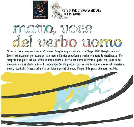 Matto, voce del verbo uomo#2 Reading-Spettacolo I MATTI DENTRO I MATTI FUORI. A quarant’anni dalla “legge 180” proviamo a fare uscire Basaglia esce dai discorsi sui manicomi per portarlo fuori, nella vita quotidiana e restituirlo a tutta la cittadinanza. Per riscoprire una parte del suo lavoro in modo nuovo e diverso ma anche coerente con quello che erano le sue intenzioni e i suoi … [Continua a leggere Matto, voce del verbo uomo. I matti dentro, i matti fuori]