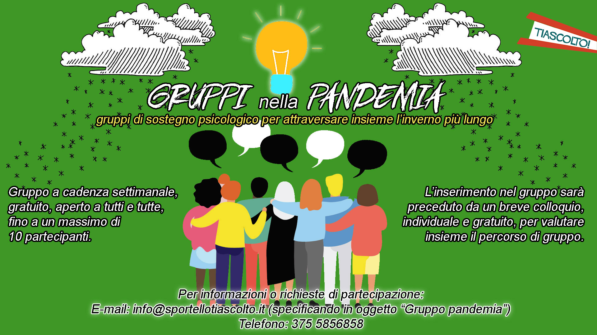 Come era già stato anticipato qualche settimana fa, abbiamo pensato a gruppi di parola gratuiti per accompagnare e sostenere le persone nelle difficoltà derivate dal fronteggiare la pandemia: ansia, angosce di contagio e di malattia, isolamento, impoverimento sociale ed economico, lutti. L’attuale emergenza sanitaria e i conseguenti lockdown sono stati e sono ancora un’inedita e intensa fonte di fatica per tutti e tutte: i … [Continua a leggere Gruppi nella pandemia: ci siamo!]