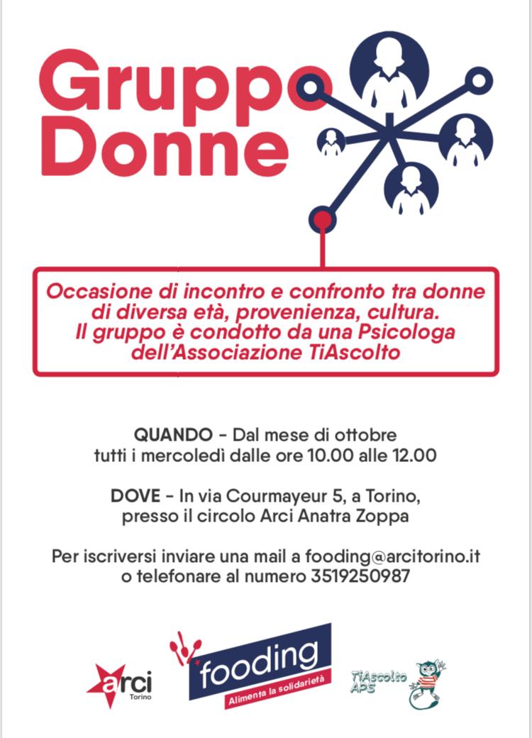 Continua la collaborazione di Sportello TiAscolto! con Arci Torino, Fooding – Alimenta la Solidarietà e Anatra Zoppa! Siamo felici di annunciare l’avvio del gruppo donne, spazio di incontro e confronto, ascolto e condivisione. QUANDO: dal mese di ottobre dalle 10.00 alle 12.00. DOVE: in Via Courmayeur 5, a Torino, presso il Circolo Arci Anatra Zoppa. Per iscriversi inviare una mail a fooding@arcitorino.it, o telefonare … [Continua a leggere Da ottobre parte il Gruppo Donne]