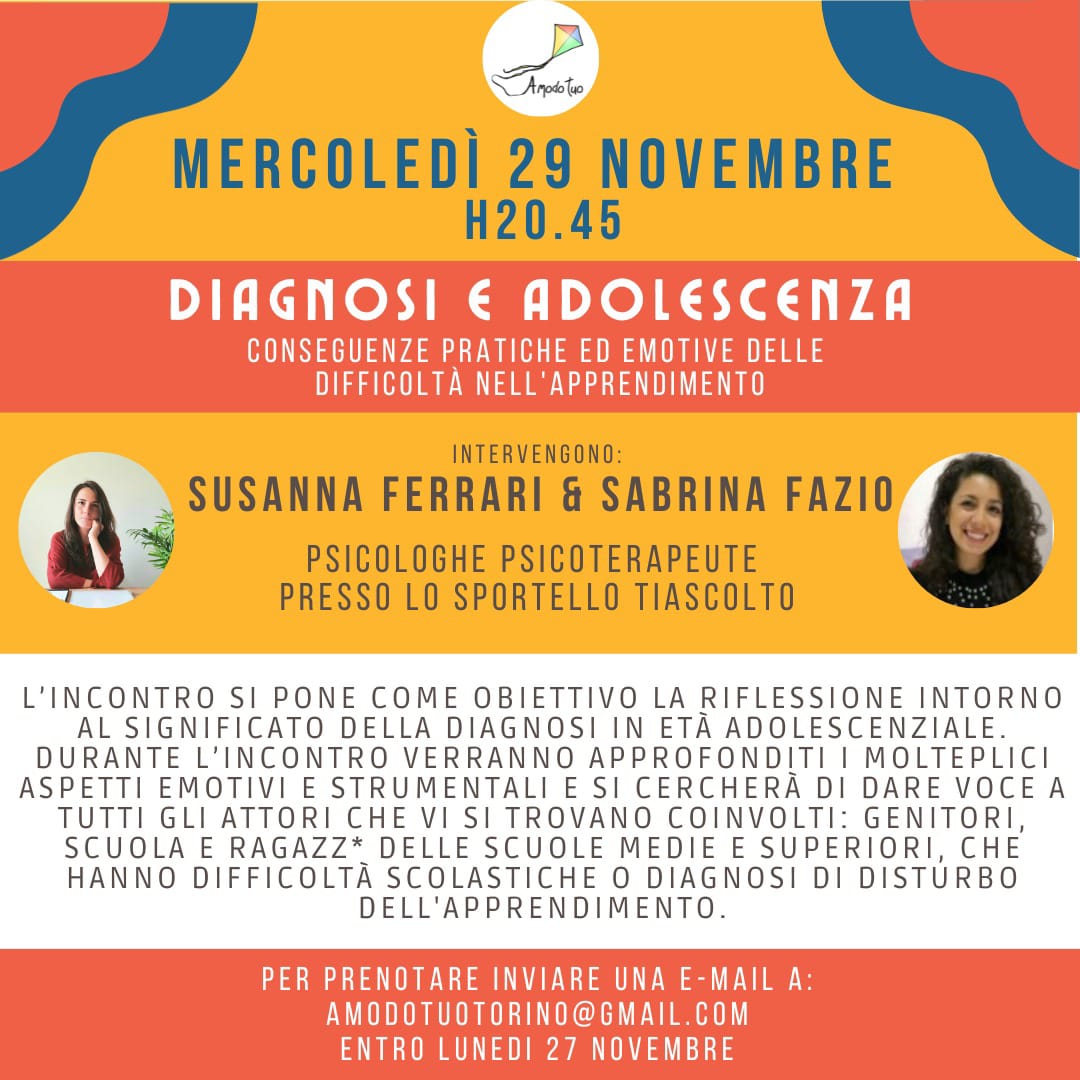 Cosa prova un* adolescent* quando fatica a raggiungere gli obiettivi scolastici? La famiglia che ruolo ha? Come affrontare tutto questo? Le psicoterapeute di Sportello TiAscolto condurranno una discussione intorno al tema della diagnosi e delle difficoltà a scuola, tenendo conto dei fattori emotivi e di contesto che intervengono. I posti sono limitati: si consiglia di prenotare alla mail indicata sopra entro lunedì 27 novembre. … [Continua a leggere Diagnosi e adolescenza. Conseguenze pratiche ed emotive delle difficoltà nell’apprendimento]