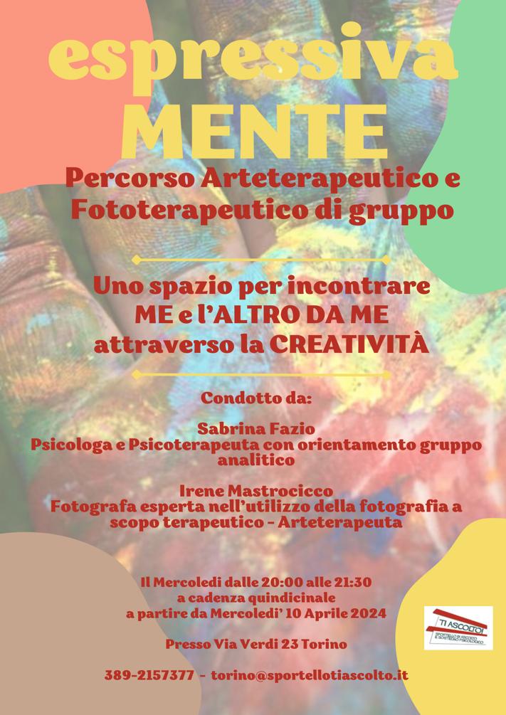 A Torino, dal mese di aprile, partirà “EspressivaMENTE. Percorso arteterapeutico e fototerapeutico di gruppo”, uno spazio per conoscere e incontrare l’Altro attraverso la creatività! 📝Il mercoledì dalle 20.00 alle 21.30, a cadenza quindicinale, a partire da mercoledì 10 aprile 2024. 🚋Via Verdi 23, Torino. ✍Per informazioni: torino@sportellotiascolto.it; 389-2157377.