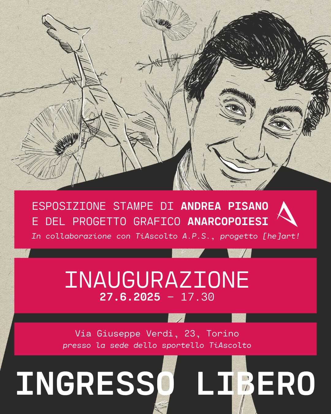 Il 27 Giugno 2025, alle 19.00 (diversamente da quanto scritto in locandina), inaugurerà l’esposizione di Andrea Pisano, Anarcopoiesi, presso la sede di via Giuseppe Verdi, 23. L’esposizione, ad ingresso libero, è la seconda all’interno del progetto [He]art! Vi aspettiamo!